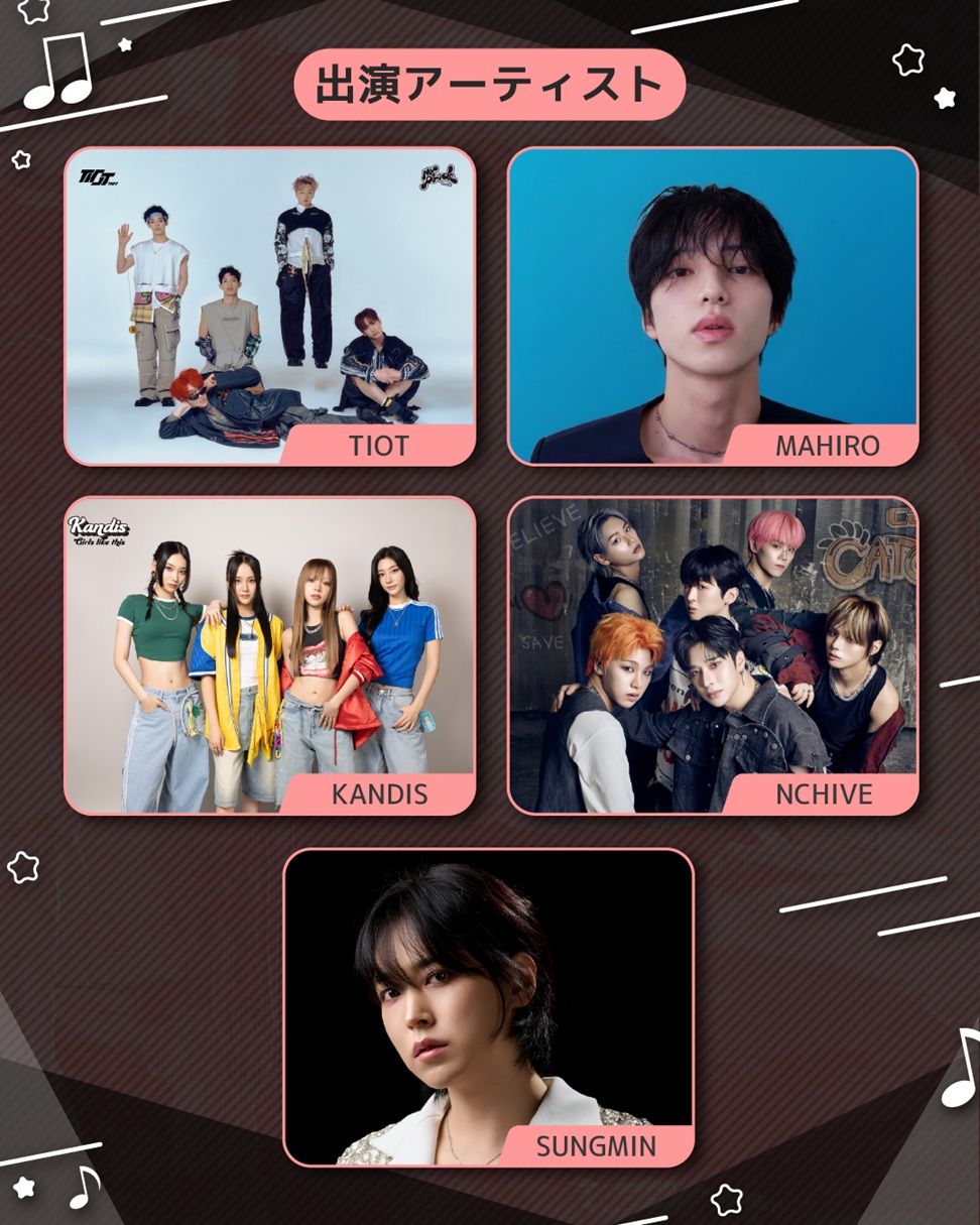 注目の出演アーティストには、昨年1月のデビュー以来、音楽番組で披露した圧倒的なパフォーマンスが話題を呼び、SNSでも「新人離れした生歌」と注目を集めているガールズグループ・Kandis、そしてK-POP第5世代を代表するボーイズグループのTIOT、NCHIVEの名が並ぶ。