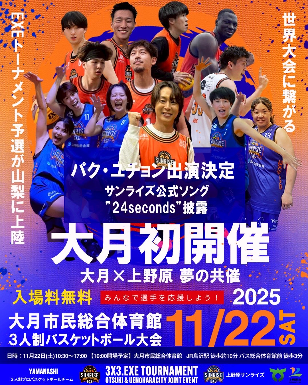 11月22日に山梨・大月市民総合体育館で開催される『3×3.EXE TOURNAMENT OTUKI ROUND』に、パク・ユチョンが出演することが決定。