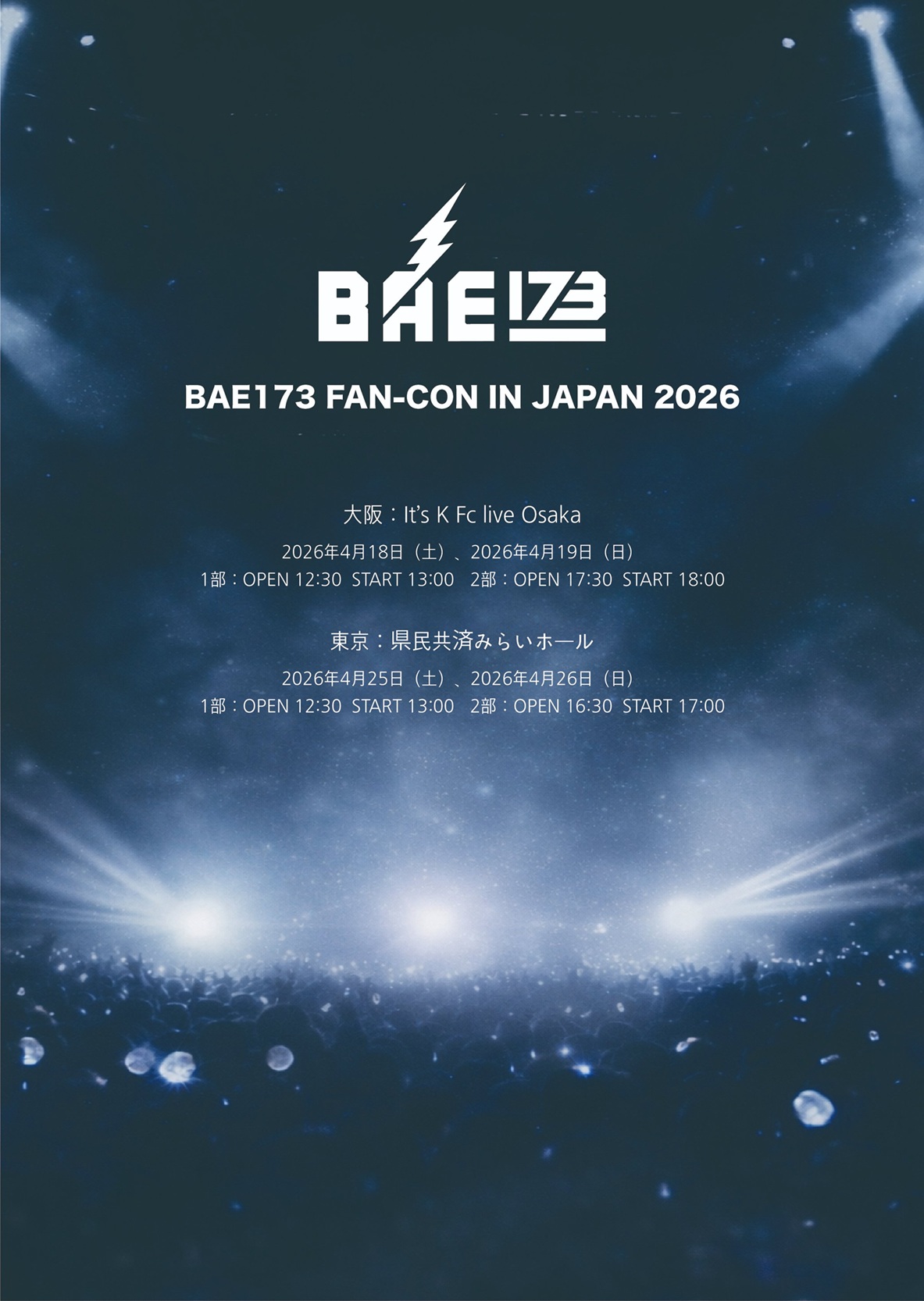 BAE173 FAN-CON IN JAPAN 2026 サイン会 [1部/2部] DATE 2026/04/23(木) OPEN 11:30 START 12:00 出演 BAE173 イベント内容 サイン, ツーショ・グループショット撮影, 録画・録音, 撮影可能 開催場所 関東 > 東京都 > 烏山区民会館 イベントの日時・詳細・出演者などは変更される可能性があります。必ず公式サイトをご確認ください。 公演概要(日程・チケットなど詳細) 『BAE173 FAN-CON IN JAPAN 2026』4月開催決定!サイン会イベントも グループのその他のイベントをチェック BAE173