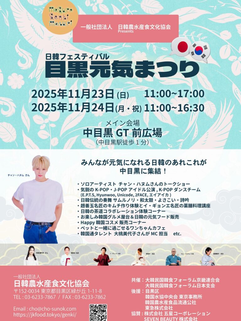 韓国の健康食をメインとした『日韓交流フェスティバル 目黒元気まつり』が、11月23日・24日の2日間、中目黒駅徒歩1分の中目黒GT前広場にて開催されることが決定。