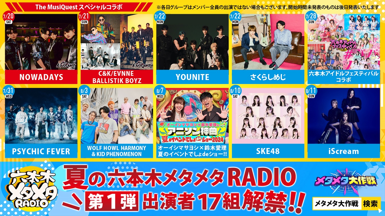 これに連動し、メタバース六本木の生配信ラジオ風番組『六本木メタメタRADIO』もパワーアップ。7月20日・21日に開催される音楽フェス『The MusiQuest』をはじめ様々なイベントとコラボし、豪華ゲストをメタバース空間に迎えここでしか聞けないトークや視聴者との交流を届ける。